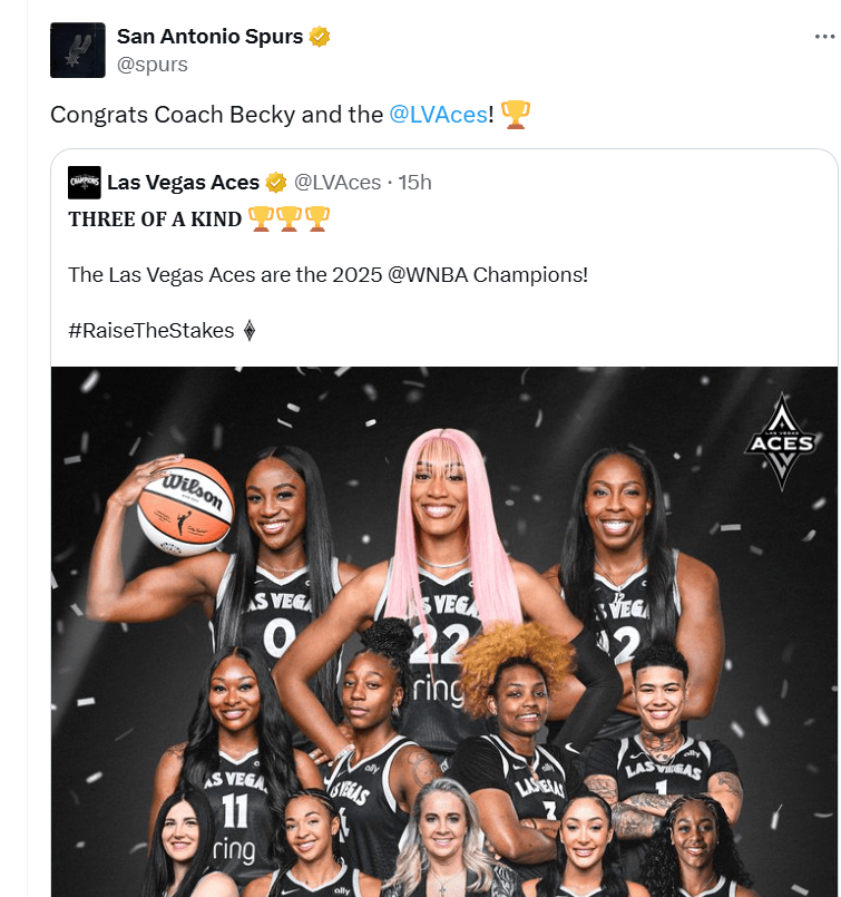 虎撲10月12日訊 馬刺官方推特發(fā)推特報(bào)道,向拉斯維加斯王牌發(fā)出祝賀。官方冠