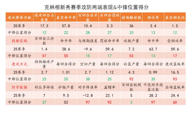 除前場(chǎng)板優(yōu)勢(shì)外,克林根確實(shí)有試圖練習(xí)現(xiàn)代中鋒的三分技能包,但百回合僅出手1.4次、命中率只有28.6%,但考慮到有很多中鋒不投三分,這兩項(xiàng)數(shù)據(jù)竟然能得到50分以上,而我相信楊瀚森常規(guī)賽在三分產(chǎn)效上超過(guò)這兩個(gè)數(shù)據(jù)是大概率事件,而上賽季聯(lián)盟所有內(nèi)線(4、5號(hào)位搖擺)和中鋒球員的平均三分線是百回合投4.9次、命中率36.2%,如果新賽季瀚森的三分能達(dá)到這個(gè)標(biāo)準(zhǔn),就會(huì)是對(duì)手不敢輕易放的三分威脅。從上面的這些數(shù)據(jù)我們可以感受到克林根在進(jìn)攻端的貢獻(xiàn)是比較偏負(fù)面,這一點(diǎn)從高階數(shù)據(jù)上也能看出——三大高階數(shù)據(jù)均在-1以下,在中鋒里也是中后等的排名。