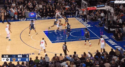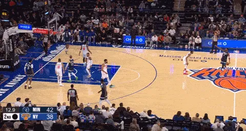半場最后一攻的這次站位比較有意思,蘭德爾和里德分列兩個底角,迪文琴佐和杰登從兩個扣籃點開始發(fā)起,一個交叉跑位后仍然是杰登把布倫森帶到弧頂給了華子點名的機會。