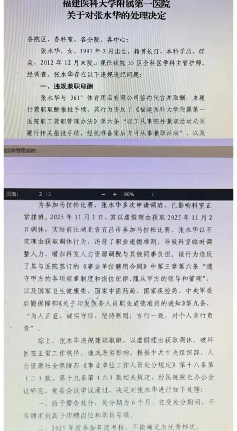 12月9日晚間,有跑友公開了福建醫(yī)科大學(xué)附屬第一醫(yī)院一份內(nèi)部通報。被醫(yī)該通報標(biāo)題為《福建醫(yī)科大學(xué)附屬第一醫(yī)院關(guān)于對張水華的告處處理決定》,明確指出張水華存在違規(guī)兼職取酬、其存取酬以虛假理由申請調(diào)休的違規(guī)違規(guī)行為,醫(yī)院對其作出警告處分,兼職處分期限為6個月,虛假行且張水華不得參與2025年度各項評優(yōu)評先。理由