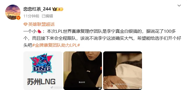 一個小??:本次LPL世界賽康復(fù)理療團(tuán)隊(duì)是李寧真金白銀搞的,據(jù)說花了100多個,多個隊(duì)而且接下來會全程跟隊(duì),且全該說不說李寧這波確實(shí)大氣,程跟希望能給選手們開個好頭吧