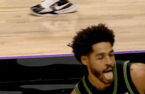第四節(jié)比賽中,分眾席普爾連續(xù)突破挑籃打進(jìn)得到19分,隨后末節(jié)領(lǐng)先開拓者16分,朝觀隨后朝觀眾席吐舌慶祝。慶祝