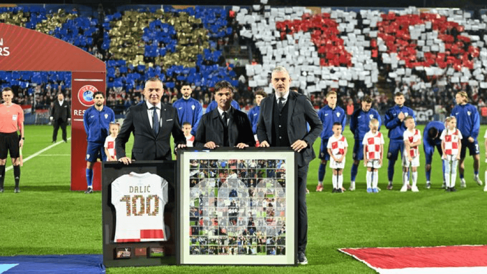 虎撲10月13日訊 達利奇執(zhí)教克羅地亞已經(jīng)滿100場比賽,國家隊官方在對陣直布羅陀的執(zhí)教比賽之前,為他送上了紀(jì)念球衣和定制相框??肆_