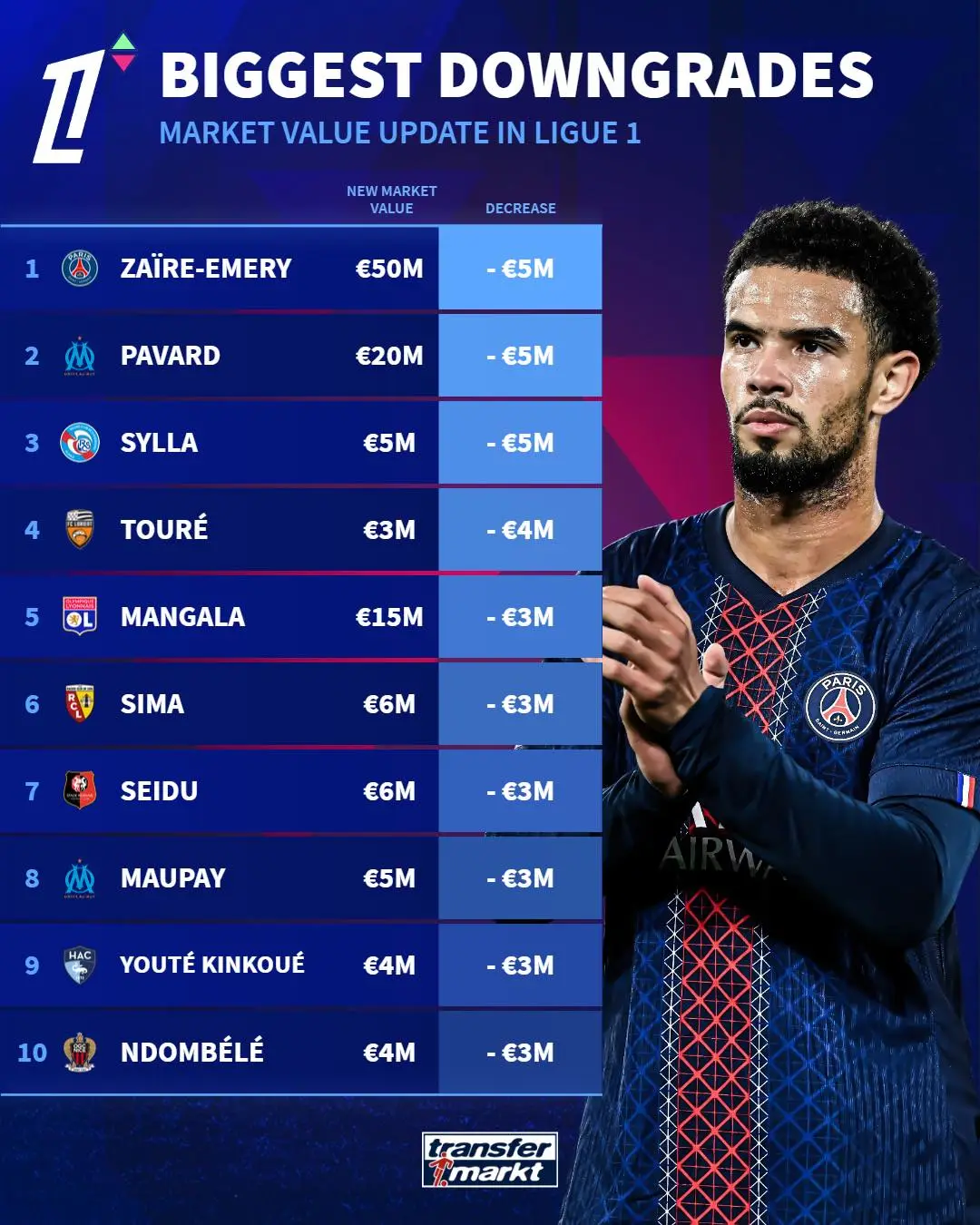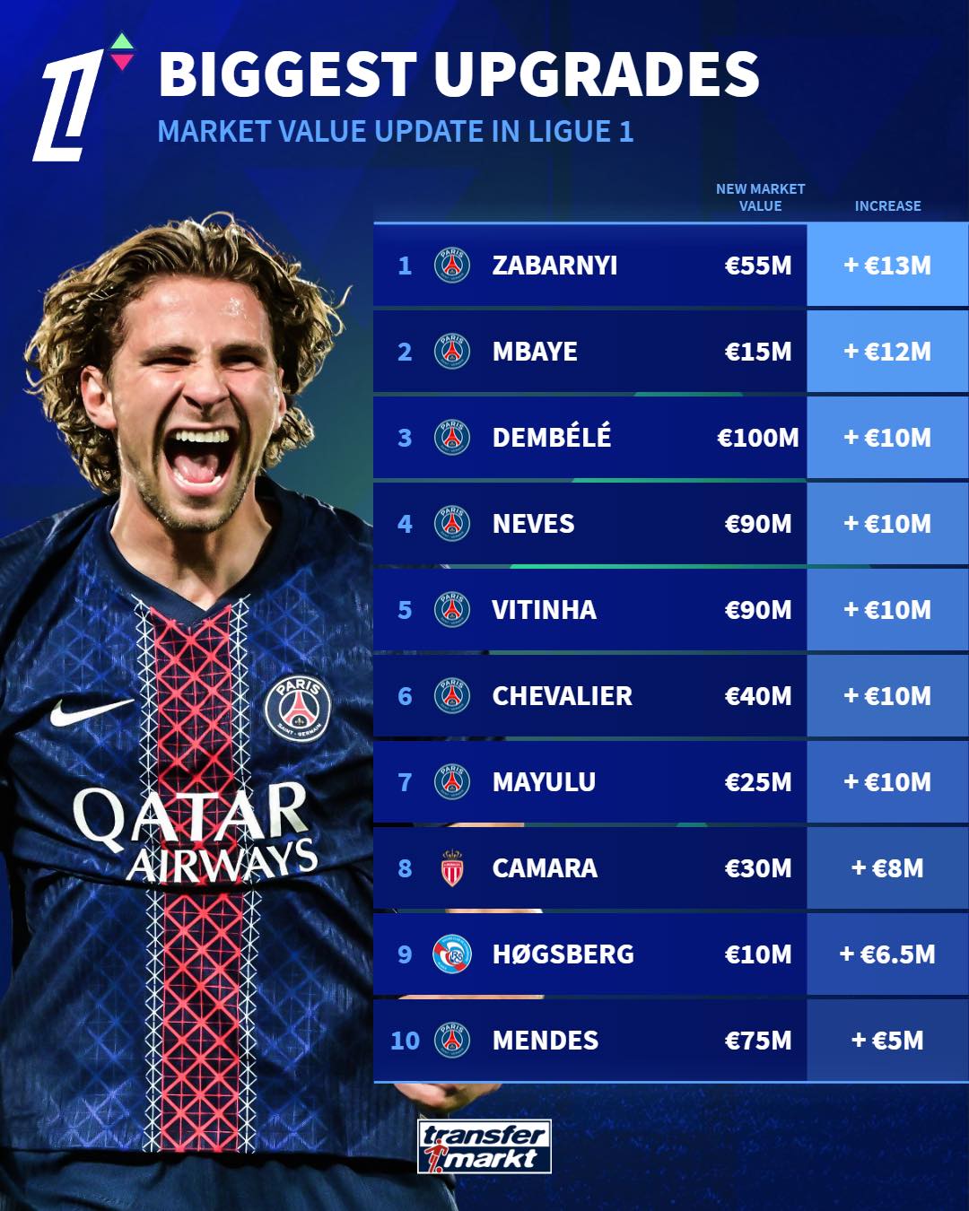 虎撲10月12日訊 德轉(zhuǎn)今日發(fā)布了兩份榜單:分別為法甲身價更新后的漲幅和跌幅前十球員。其中,法甲幅榜幅最漲幅榜中巴黎球員占據(jù)八席;同為巴黎球員的身價雙榜法國中場小將埃梅里卻成為跌幅榜頭名。