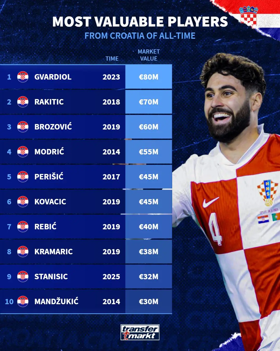 克羅地亞歷史身價(jià)榜: