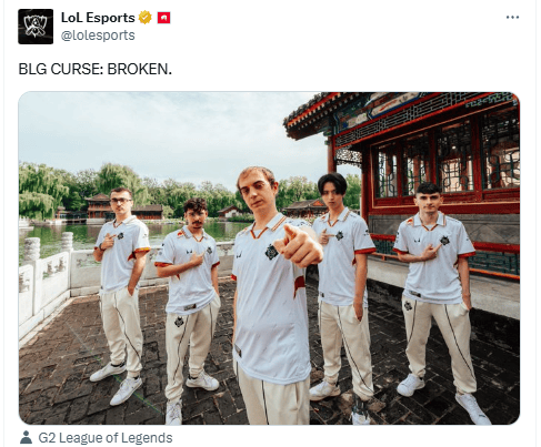 虎撲10月18日訊 LOL官推曬G2合影并配文:G2打破了BLG魔咒