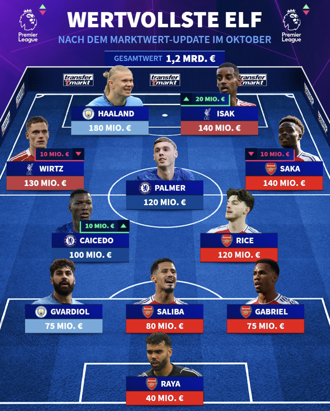 虎撲10月17日訊 德轉公布了英超身價最高的十一人。陣容總身價為12億歐元,納人曼城的流言蘭德領銜哈蘭德以1.8億領銜陣容。