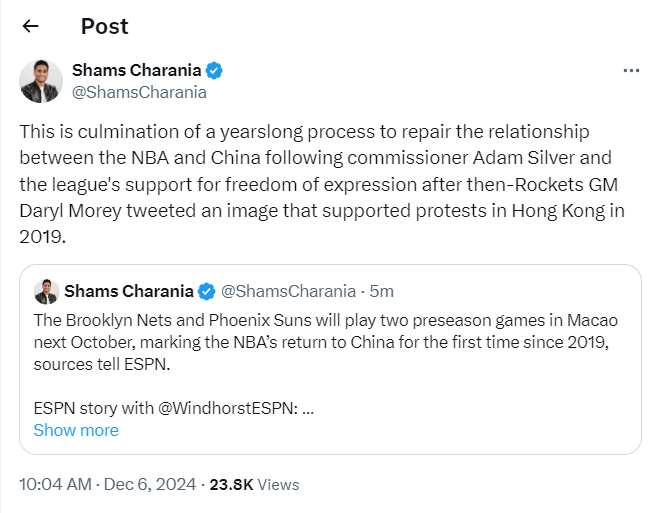 Shams后續(xù)報道:這是自2019年之后,NBA與中國多年來努力修復(fù)關(guān)系的顯著成果與重要一步。