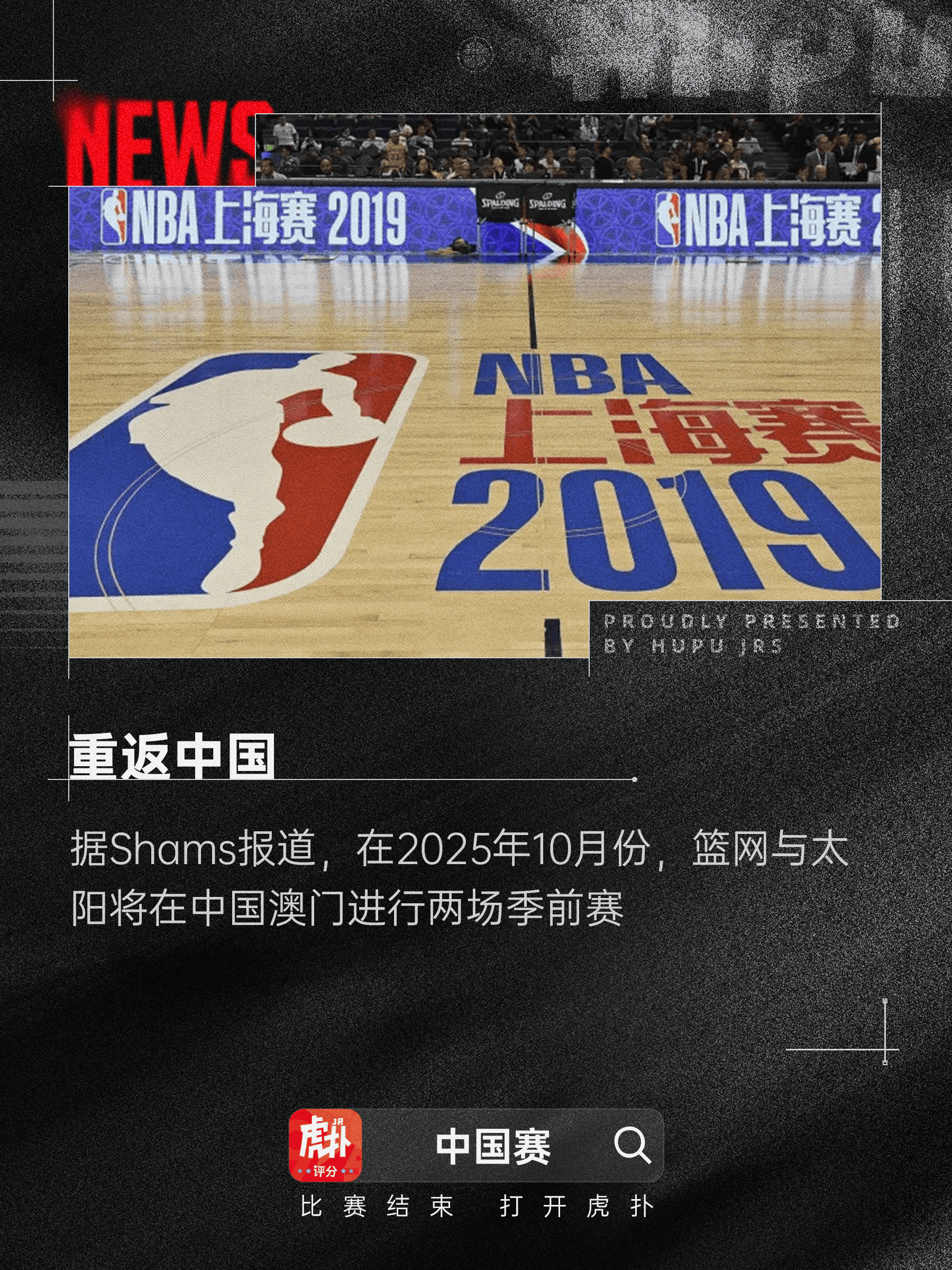 虎撲12月06日訊 今日根據(jù)知名記者Shams的報道,在2025年10月份,賽N時隔籃網(wǎng)與太陽將在中國澳門進(jìn)行兩場季前賽?;刂?/p>